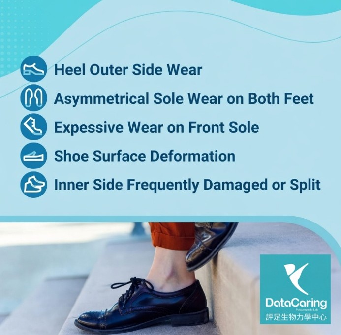 a) Wear on the outside of the heel b) Asymmetrical wear on the soles of both feet c) More wear on the forefoot sole d) Upper deformation e) The inside of the upper is often easily broken, stretched
